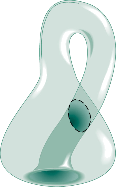 Klein bottlen.(名词) Clarinda/Academy Artworks- A one-sided topologic surface having no inside or outside, formed by inserting the small open end of a tapered tube through the side of the tube and making it contiguous with the larger open end.克莱因瓶:一种既没有内表面也没有外表面的单侧拓扑面,它是通过把逐渐变细的管子的小的开端插入管壁并使它与大的开端相连而形成的