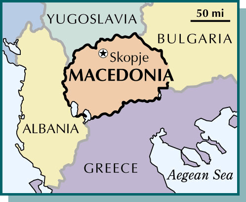 - A region of southeast Europe on the Balkan Peninsula including parts of modern-day Greece, Bulgaria, and Yugoslavia. After the fall of the Alexandrian empire, it was held by Romans, Byzantines, Bulgars, Serbs, and Turks. The present division was largely determined after the Second Balkan War (1913).马其顿:欧洲东南部巴尔干半岛上一地区,包括今天的希腊、保加利亚和南斯拉夫的部分地区。亚历山大帝国灭亡后,罗马人、拜占庭人、保加利亚人、塞尔维亚人和土耳其人先后统治过该地区。现今的划分基本上是在第二次巴尔干战争(1913年)后划定的