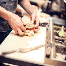 A person creating a made to order sandwich.
