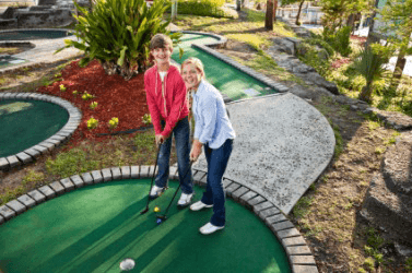 Teenagers playing miniature golf.