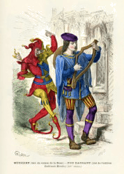 An engraving of a medieval minstrel.
