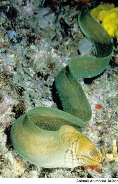 1. Any of numerous chiefly tropical, brightly colored marine eels of the family Muraenidae that are ferocious fighters and commonly inhabit coral reefs.海鳝:任一种生活于热带地区的海鳝科鲜艳海鳝鱼,它凶恶好斗并通常居住于珊瑚礁中