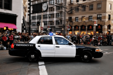 A police car obstructs the road.