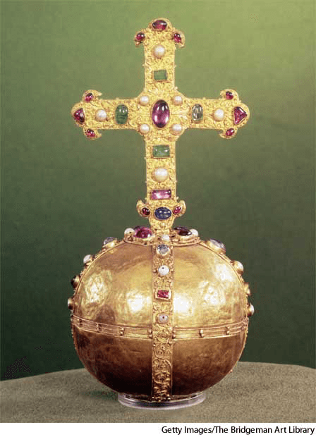 1. A globe surmounted by a cross, used as a symbol of monarchial power and justice.权球:顶上装有一个十字架并象征着群权和公正的球