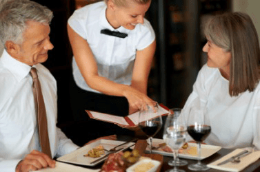 A waiter assists a couple with their restaurant order.