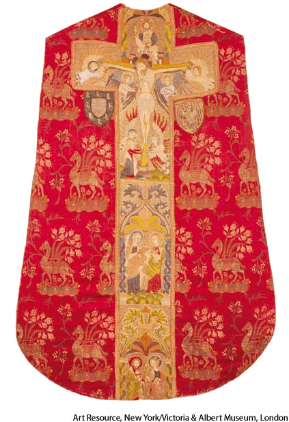 1. A band of elaborate embroidery decorating the front of certain ecclesiastical vestments.精制的刺绣品:装饰于特定基督教法衣前部的精心制作的刺绣品