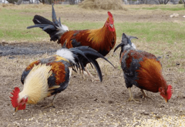 Chickens pecking in the yard.