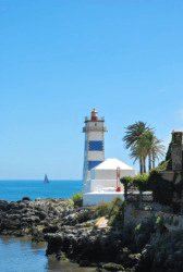 A lighthouse set against an azure sky.