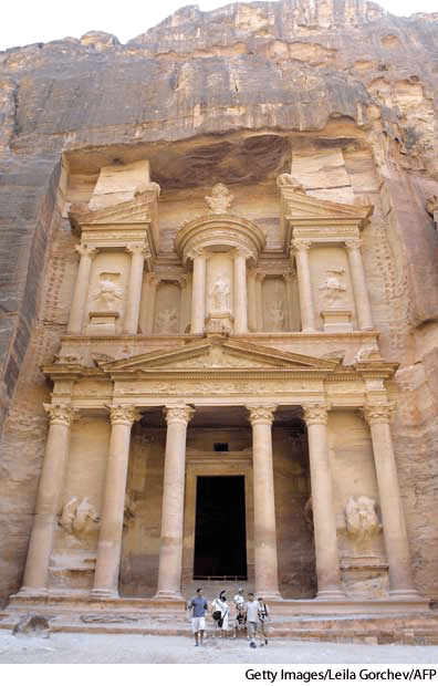 Pe·tra AHD[pēʹtrə, pĕtʹrə] D.J.[ˈpiːtrə, ˈpetrə]K.K.[ˈpitrə, ˈpɛtrə]NONE(无词性) Petracarved from sandstone, the façade of the Treasury at Petra is over 130 feet high- An ancient ruined city of Edom in present-day southwest Jordan. It flourished as a trade center from the 4th centuryb.c. until its capture by the Romans in a.d. 106. The city was taken by Moslems in the 7th century and by Crusaders in the 12th century. The ruins of the "rose-red city" were discovered in 1812. 佩特拉:埃多姆王国的一个古代城市废墟,位于现在的约旦西南。从公元前 4世纪直到 公元 106年被罗马人占领,它一直是一个繁华的贸易中心。7世纪被穆斯林人统治,12世纪又被十字军统治。这座“紫红色的城市”的废墟于1812年被发现