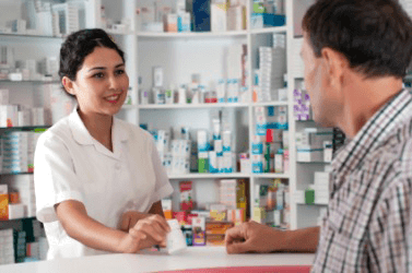 A man receiving medication at a pharmacy.