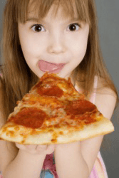 A little girl eats a big piece of pizza.