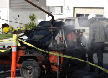 Pitch being heated before applying it to a roof.