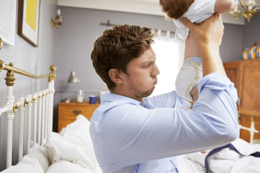 A father inspecting his son's diaper for poo poo.