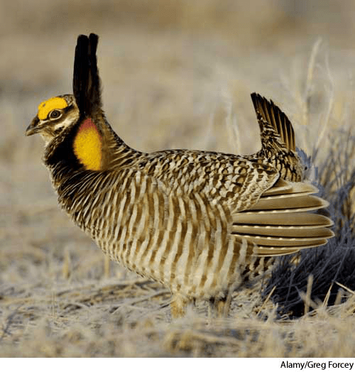prairie chickenn.(名词) prairie chickenmale greater prairie chicken,Tympanuchus cupido,performing courtship display- Either of two birds(Tympanuchus cupido or T. pallidicinctus) of the grouse family, found in western North America and having deep-chested bodies and mottled brownish plumage. 草原松鸡:松鸡科两类鸟中任一种(北美草原松鸡 或 小草原松鸡) ,产于北美洲西部,胸部颜色较深,羽毛呈浅棕色且有斑点