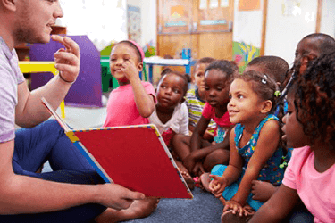 A teacher reading a story to a group of preschool students.