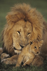 Male lion with cub on a preserve in the Masai Mara National Reserve, Kenya
