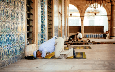Man offering Namaz at mosque by taking on a prostrate position.