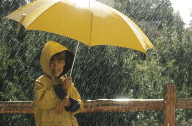 The boy has protection from the rain by using his umbrella.