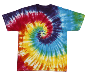 The tie dye shirt has a psychedelic pattern and bright colors.
