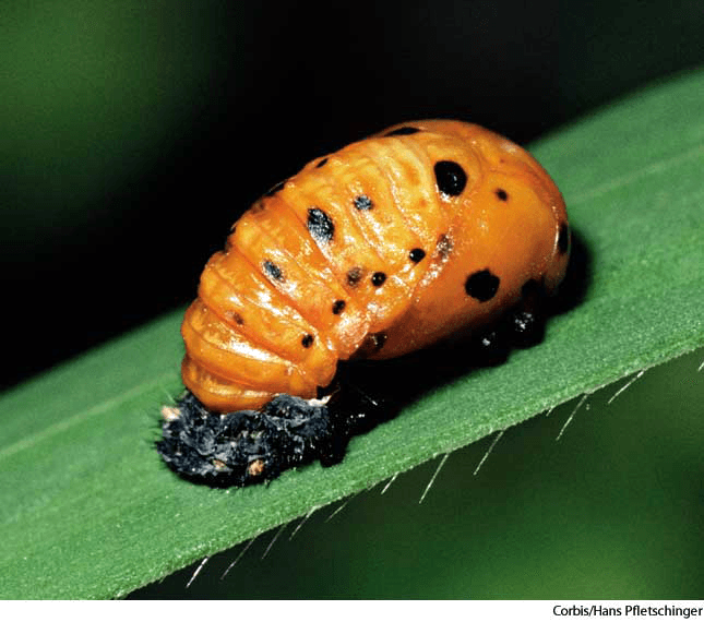 pu·pa AHD[pyo͞o′pə] D.J.[ˈpjuːpə]K.K.[ˈpjupə]n.(名词)【复数】 pu.pae[-pē] 或 pu.pas  pupaladybug pupa- The nonfeeding stage between the larva and adult in the metamorphosis of holometabolous insects, during which the larva typically undergoes complete transformation within a protective cocoon or hardened case.蛹:全变态昆虫从幼虫到成虫的变形时期的不进食阶段,这一阶段内,幼虫在一种起保护作用的茧或硬壳中独特地完成变形的全过程