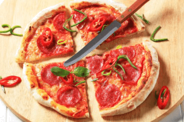 A quartered pizza.