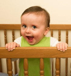 A cute baby holding the rail of his crib.