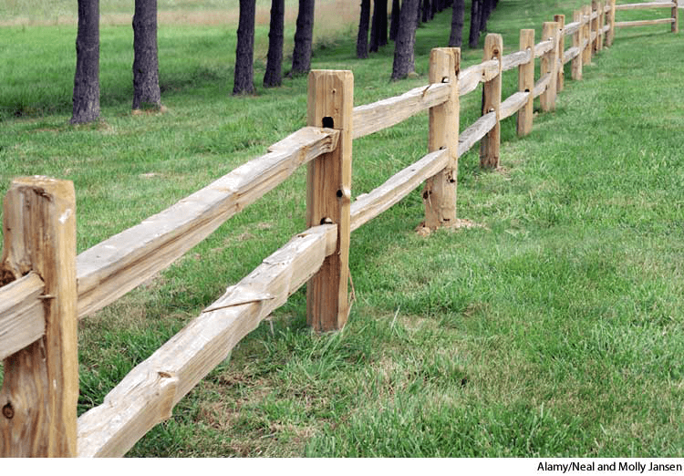 A fence of split logs secured to stakes or laid across each other at an angle.