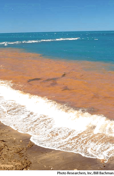 red tiden.(名词) red tide- A bloom of dinoflagellates that causes reddish discoloration of coastal ocean waters. Certain dinoflagellates of the genusGonyamlax produce toxins that kill fish and contaminate shellfish. 赤潮:由于毒双鞭甲藻的而大量产生使沿岸海水变红,有些膝沟藻属 的双鞭甲藻产生杀死鱼和受污染的贝类毒素