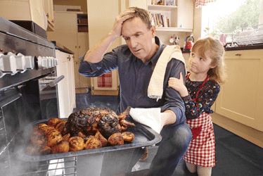 Violet's dad was remiss in keeping an eye on the chicken roasting in the oven and now dinner is ruined.