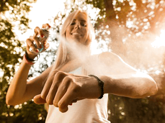 Tammie applies bug spray to repel mosquitos before she goes for a hike on the trail.