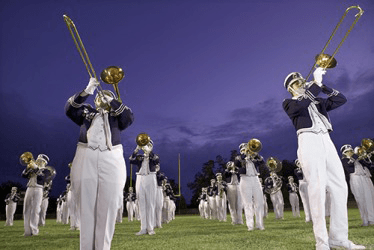 The high school marching band's repertoire of songs includes classic as well as pop music favorites.