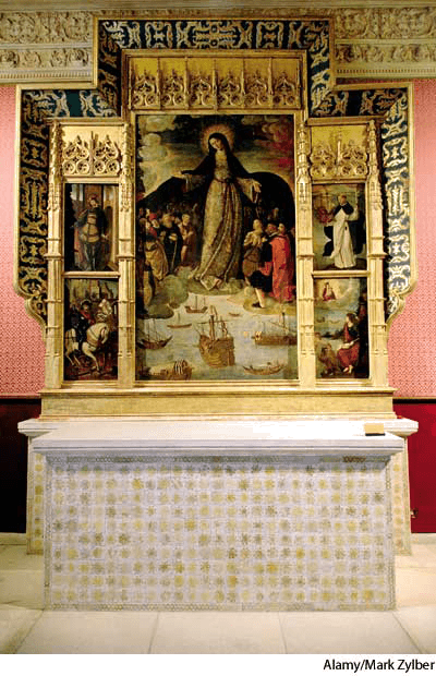 re·ta·ble AHD[rēʹtā'bəl, rĕtʹə-] D.J.[ˈriːˌteɪbəl, ˈretə-]K.K.[ˈriˌtebəl, ˈrɛtə-]n.(名词) retablealtarpiece for the chapel of the Casa de Contratación at the AlcázarSeville, Spain- A structure forming the back of an altar, especially:祭坛的后部结构,尤指: