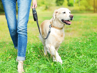 Regan uses a dog leash that retracts for her dog Annabelle when they walk in the park.