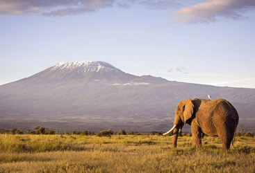 A cattle egret sits on the ridge of an elephant's back at Amboseli National Park in Kenya.