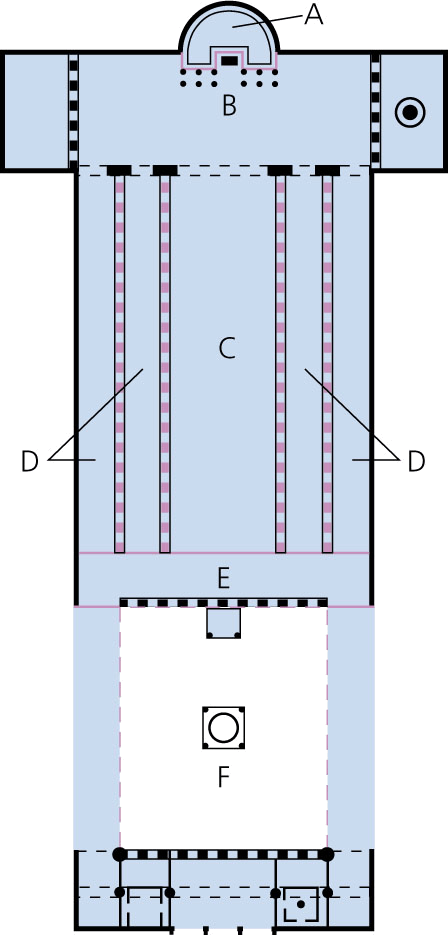- A Christian church building of a similar design, having a nave with a semicircular apse, two or four side aisles, a narthex, and a clerestory.长方形廊柱大厅基督教堂:相同设计的基督教堂建筑,包括有半圆形的教堂正厅,两边或四边的走廊,一个门厅和一个高窗