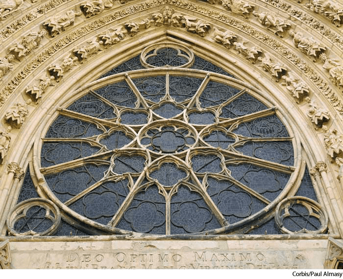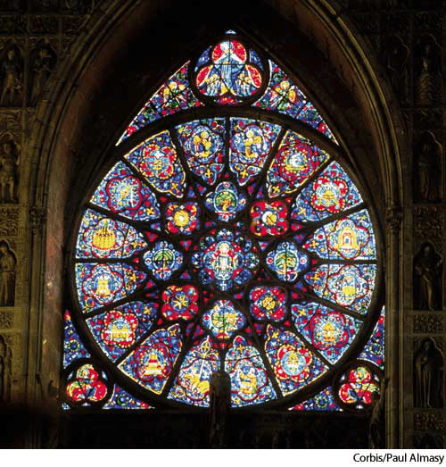 rose windown.(名词)   rose windowtop: exterior view of the rosewindow in the west portalof the Cathedral of Notre-DameReims, Francebottom: interior view of the window- A circular window usually of stained glass with radiating tracery suggesting the form of a rose.圆花窗:一种有彩色玻璃的圆形窗户,其辐射状的花式窗格使人联想起玫瑰花的形状