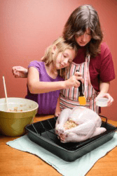 A child helping her mother to baste a turkey.
