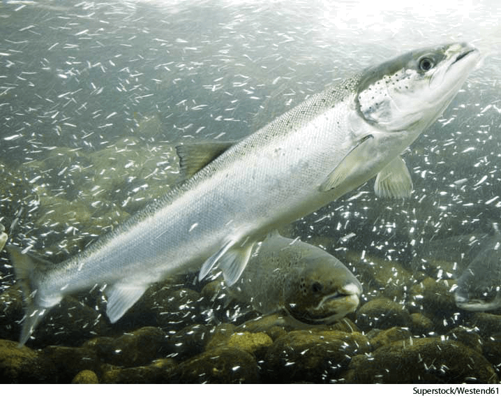 salm·on AHD[sămʹən] D.J.[ˈsæmən]K.K.[ˈsæmən]n.(名词)【复数】 salmon 或 salm.ons  salmonAtlantic salmon smoltSalmo salar- Any of various large food and game fishes of the generaSalmo and Oncorhynchus, of northern waters, having delicate pinkish flesh and characteristically swimming from salt to fresh water to spawn. 鲑,大麻哈鱼:北部海域中鲑属 和 大麻哈鱼属的 各种大食鱼或猎物鱼,具有柔嫩粉红色肉,特征是从咸水游到淡水中去产卵