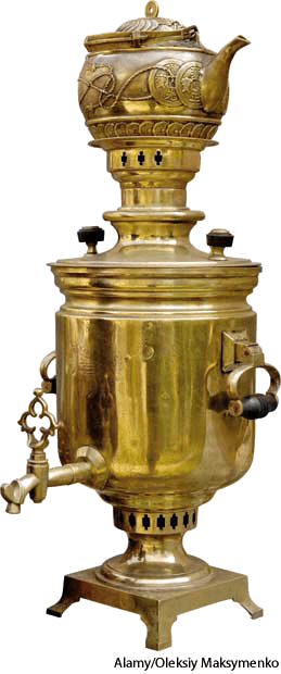 sam·o·var AHD[sămʹə-vär'] D.J.[ˈsæməˌvɑː]K.K.[ˈsæməˌvɑr]n.(名词) samovar- A metal urn with a chimney, a vertical compartment for hot charcoal, and a spigot, used especially by Russians to boil water for tea.烧水的铜壶:金属壶,具有烟囱和(产放热木炭)的直立格间以及一个龙头,尤其是俄国人用来烧热水冲茶