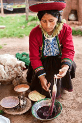The Peruvian woman saturates the wool yarn with a natural purple dye in preparation for weaving colorful textiles.