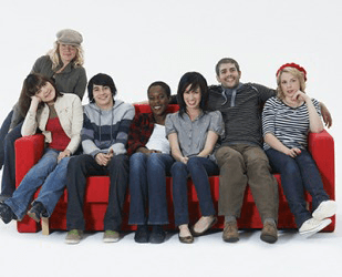 The group of friends had to scooch closer together to fit everyone on the couch for the photo.