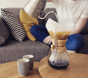 He pours hot water into the filter so that it can slowly seep through the coffee grounds to make a pot of fresh coffee.