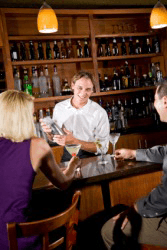 A bartender serves drinks.