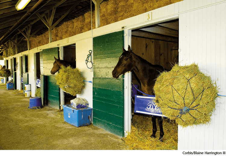 马棚:赛马路道旁边面对走道的一排或双排马棚,每匹马都有单独的马厩