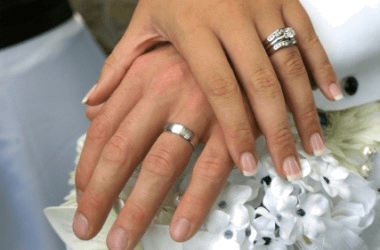 A bride and groom show their new belongings.