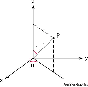 spherical coordinaten.(名词) spherical coordinateThe spherical coordiantes of point P are (r, ϕ, θ).- Any of a set of coordinates in a three-dimensional system for locating points in space by means of a radius vector and two angles measured from the center of a sphere with respect to two arbitrary, fixed, perpendicular directions.球体坐标:任何一组三度坐标系,藉由矢径及自球体中心点任意往两个固定垂直方向的箭头来指出空间中的任何一点