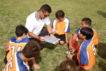 A coach discusses strategy with his team.