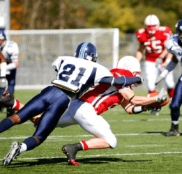 One football player tackles another.