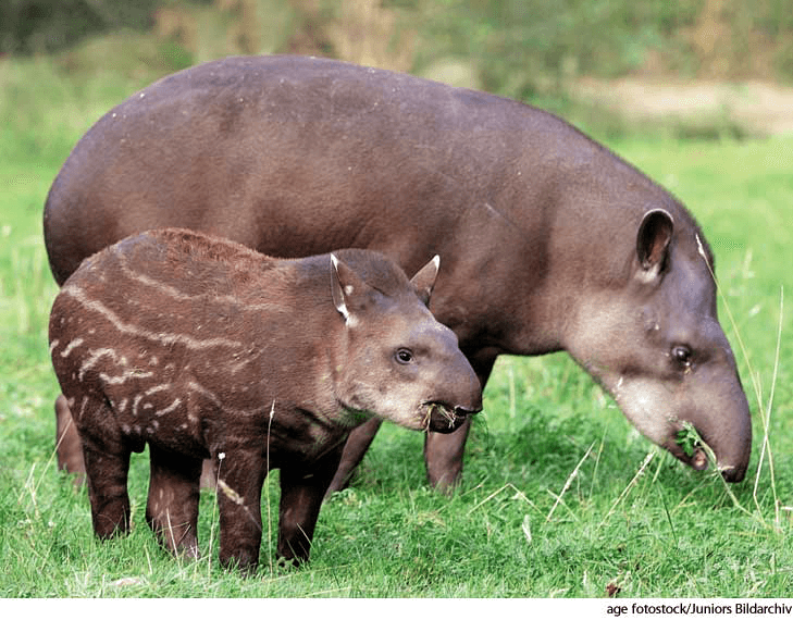 ta·pir AHD[tāʹpər, tə-pîrʹ] D.J.[ˈteɪpə, təˈpɪə]K.K.[ˈtepɚ, təˈpɪr]n.(名词) tapiradult (background) and juvenile (foreground) Brazilian tapirsTapirus terrestris- Any of several large, chiefly nocturnal, odd-toed ungulates of the genusTapirus of tropical America, the Malay Peninsula, and Sumatra, related to the horse and the rhinoceros, and having a heavy body, short legs, and a long, fleshy, flexible upper lip. 貘:任一种生活于热带美洲、马来半岛和苏门答腊岛的貘 属的个体较大,主要在夜间活动且具有奇数足趾的有蹄类哺乳动物,它和马、犀牛有亲缘关系,长有粗壮的躯体,短短的腿和一块长而多肉的富有弹性的上唇