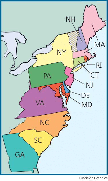 Thir·teen Colonies AHD[thûr-tēnʹ] D.J.[θɜːˈtiːn]K.K.[θɝrˈtin]NONE(无词性) Thirteen Colonies- The thirteen British colonies in North America that joined together to form the original states of the United States, including New Hampshire, Massachusetts, Rhode Island, Connecticut, New York, New Jersey, Pennsylvania, Delaware, Maryland, Virginia, North Carolina, South Carolina, and Georgia.十三个殖民地,美国最初十三州:位于北美的13个英国殖民地,后来合并形成美国最初的几个州,包括新罕布什尔州、马萨诸塞州、罗得岛州、康涅狄克州、纽约州、新泽西州、宾夕法尼亚州、特拉华州、马里兰州、弗吉尼亚州、北卡罗来纳州、南卡罗来纳州、乔治亚州